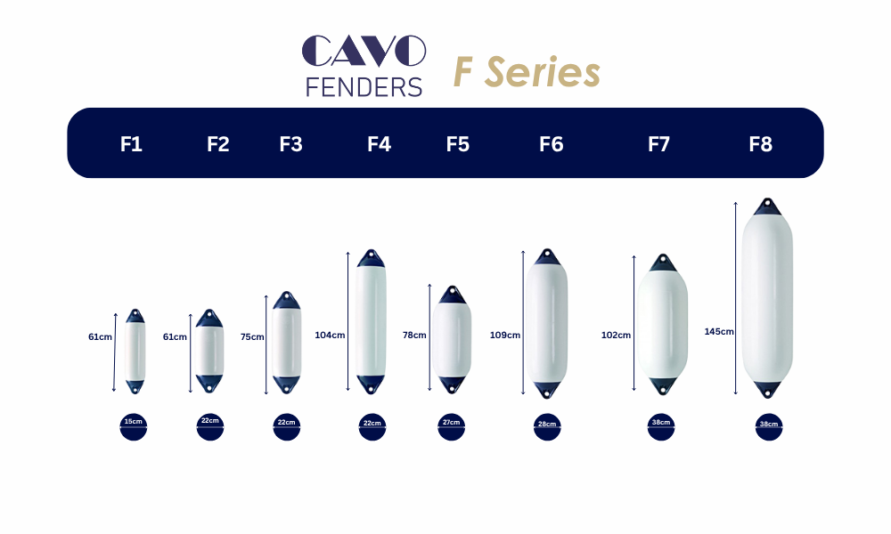 Cavo Fender F Series are heavy-duty, rotationally molded cylindrical fenders crafted for optimal protection of yachts and fishing vessels. Available in sizes F‑1 through F‑8, these fenders come in three striking finishes: